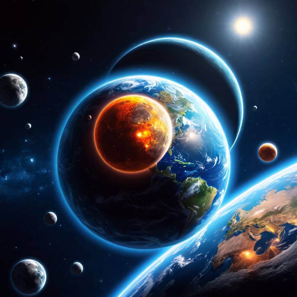 Prompt: prompt:Danger Sun in space, realigning planet Earth, moon and many stars in the background, satellite, HDR, UHD, 8K style.