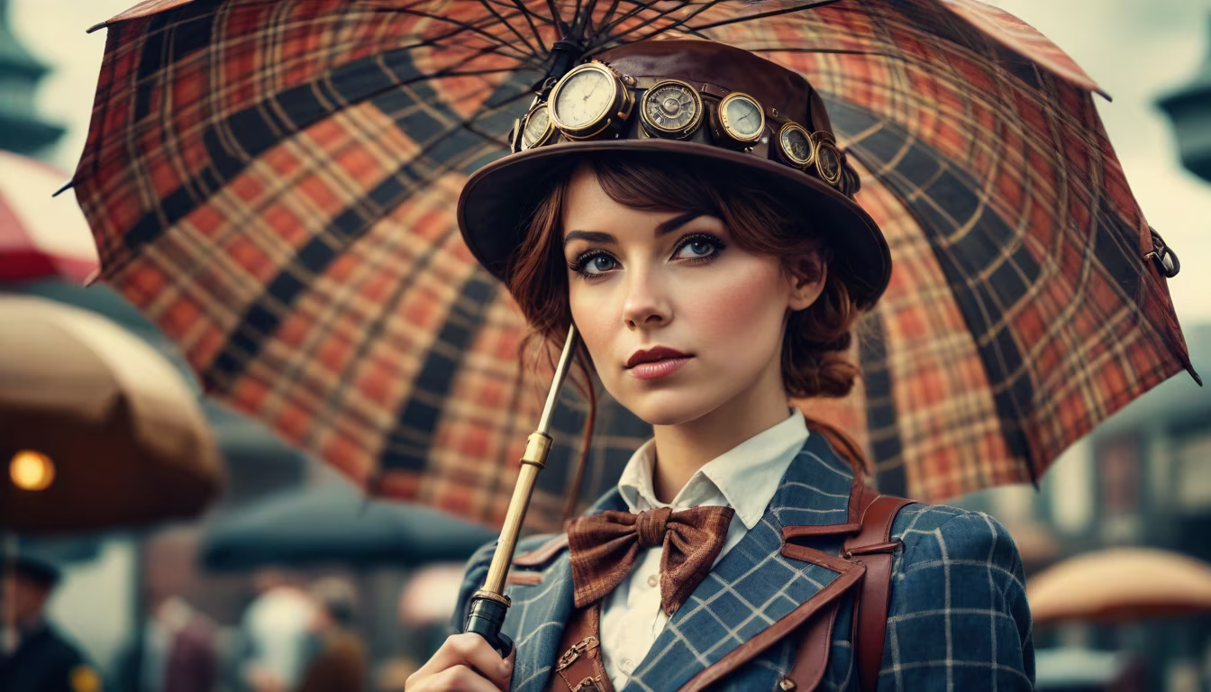 Prompt: sexy steampunk tripper girl hd bikini plaid umbrella hd 32k 3d