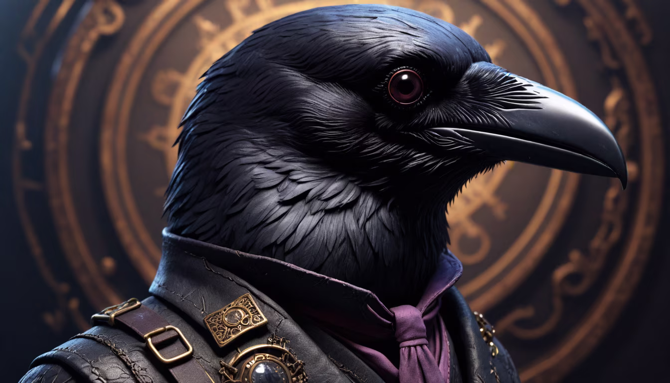 Prompt: dark deep feeling raven Edgar Allan Poe hd steampunk hipster anthropomorphic fantasy art hd 32k 3d