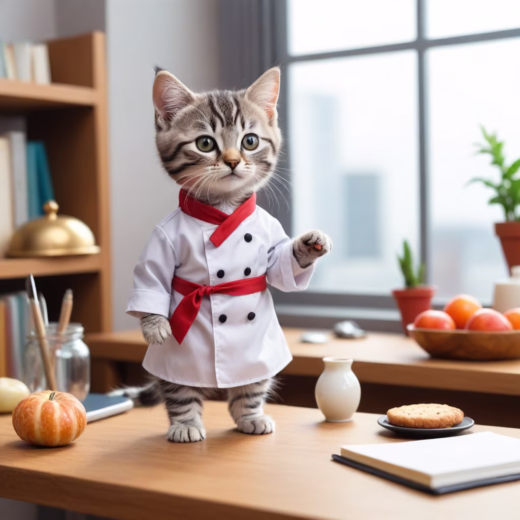 Prompt: In the study room, by the window, a cute little humanoid kitten standing and walking, gray tabby cat, on the desk, dressed in chef costume, on the desk table,
