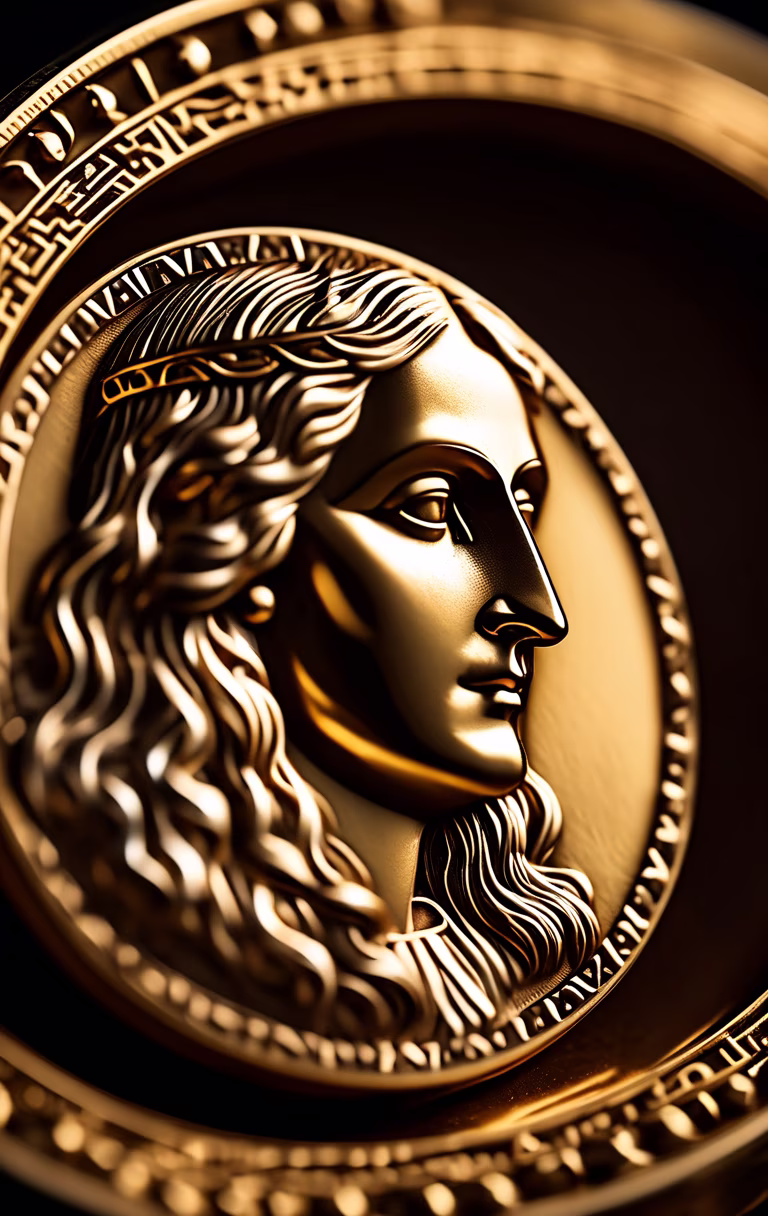 Prompt: product photography, gold coin inlaid with da Vinci's face in high relief, with intricate details Silver coin from the high hierarchy medieval era, macro photography, side view from below, Canon Eos R5, wireless, f/4, high realism, ultra detailed
