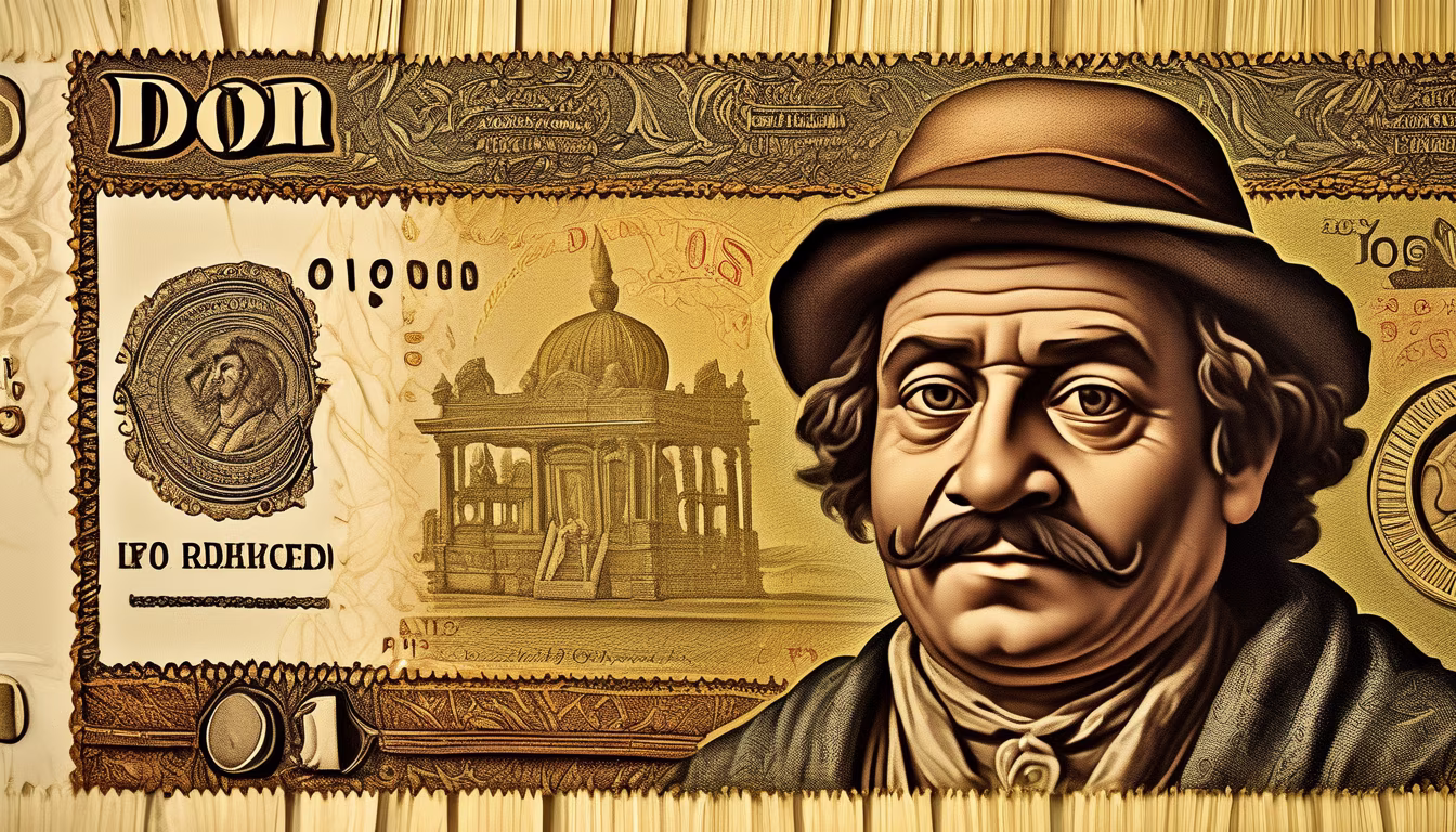 Prompt: product photography, Don Ramón central figure on paper currency currency banknote, central figure of Don Ramón del Chavo del Ocho, porous texture in relief of the bill can be felt, ornamental designs in the style of Leonardo da Vinci in high relief, with details intricate gilding, high value l paper money, macro photography, side view from below, Canon Eos R5, wireless, f/4, high realism, ultra detailed