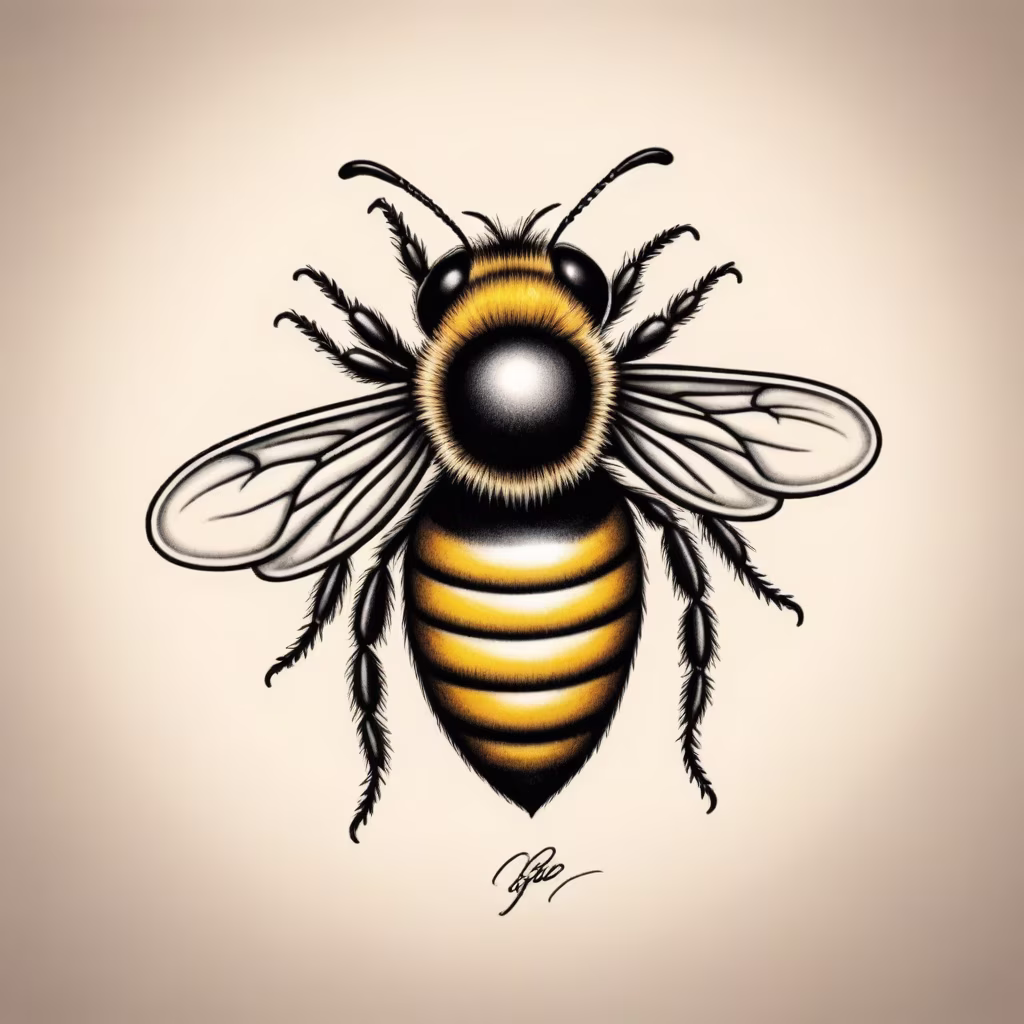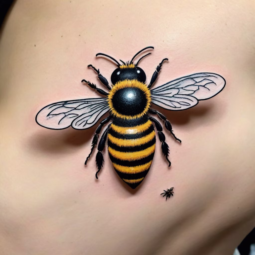 Prompt: script tattoo with small butt tattoo of bee on its back sleeping on a flower around