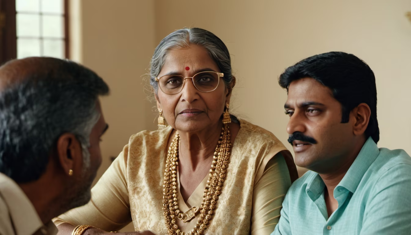 Prompt: a 55 year old indian woman in a traditonal gujrati family, house has a lot of gold items, on the dining table are seated her family members - a 60 year old man, 1 teenage guy, 1 teenage girl, two 80 year old traditional parents. everyone is looking at the 55 year old woman