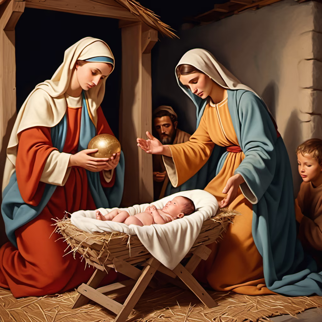 Prompt: Birth of Baby Jesus, style Orthodox tradition, mood Sacred and reverent, time-era Ancient, perspective Depicting the Nativity scene, foreground Baby Jesus, background Orthodox iconography, lighting Soft and divine, setting Bethlehem stable, symbolism Divine birth and religious significance, dominant-color-palette Rich and symbolic colors, ar 3:2
