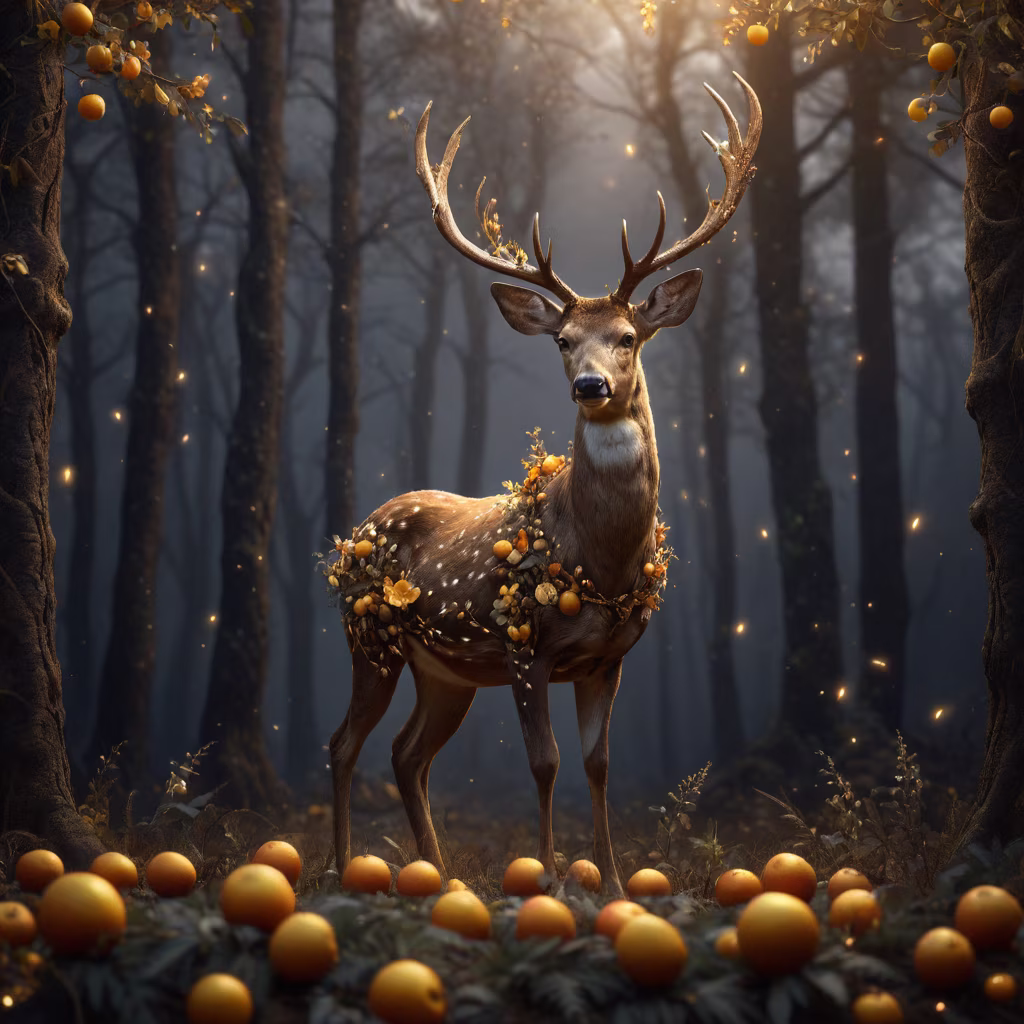 Prompt: A deer stands in the forest, sparkling at night, with its antlers covered in fruits and flowers, deep gold and light amber, UHD image, Philip McKay, Baroque animal, Unreal Engine 5, dark gray and light gold