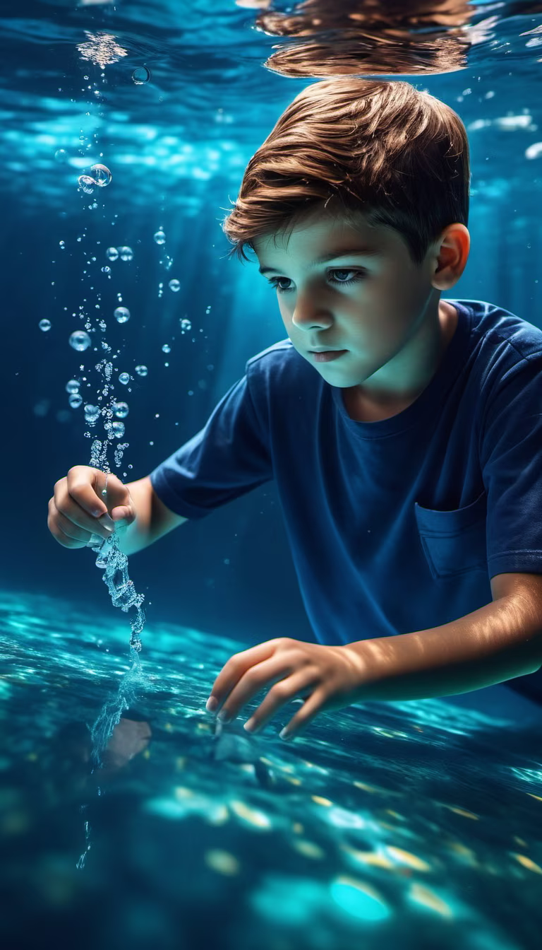 Prompt: a sporty boy underwater paints a large abstract picture on canvas, neon light