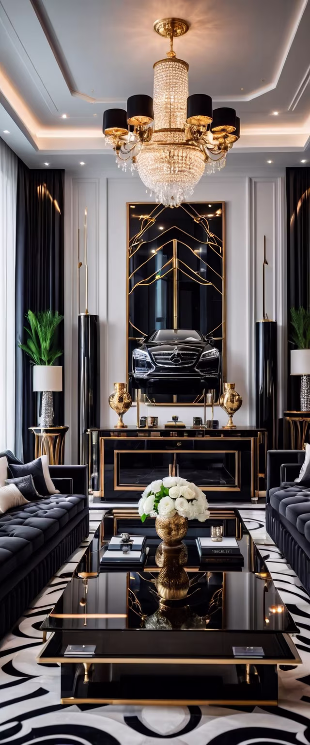 Prompt: A large modern living room, elegant, luxurious class. An interior with luxury furniture, white and black color, a modern style, maximalist, glass, luxury car in the living room, symmetrical room.