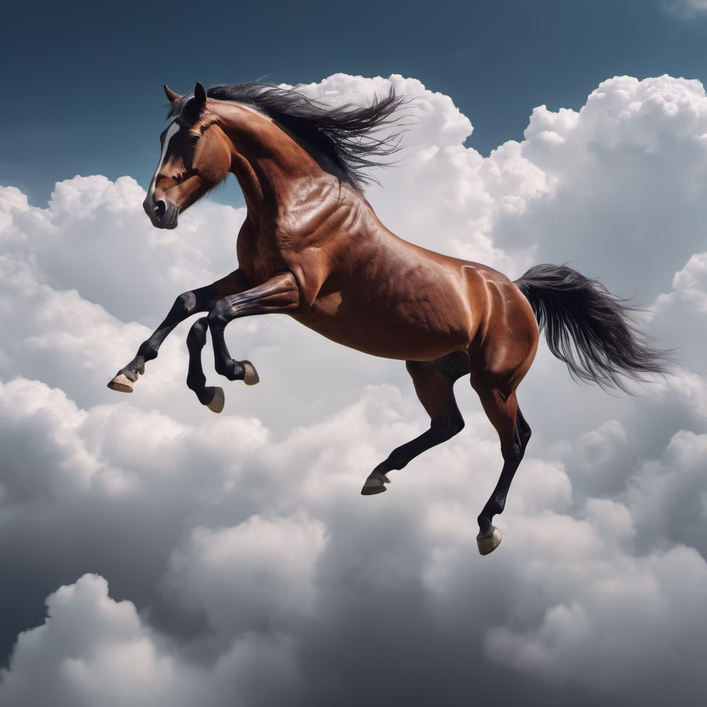 Prompt: extreme wide shot action still of a wild winged pinto horse jumping 15 feet high in the clouds