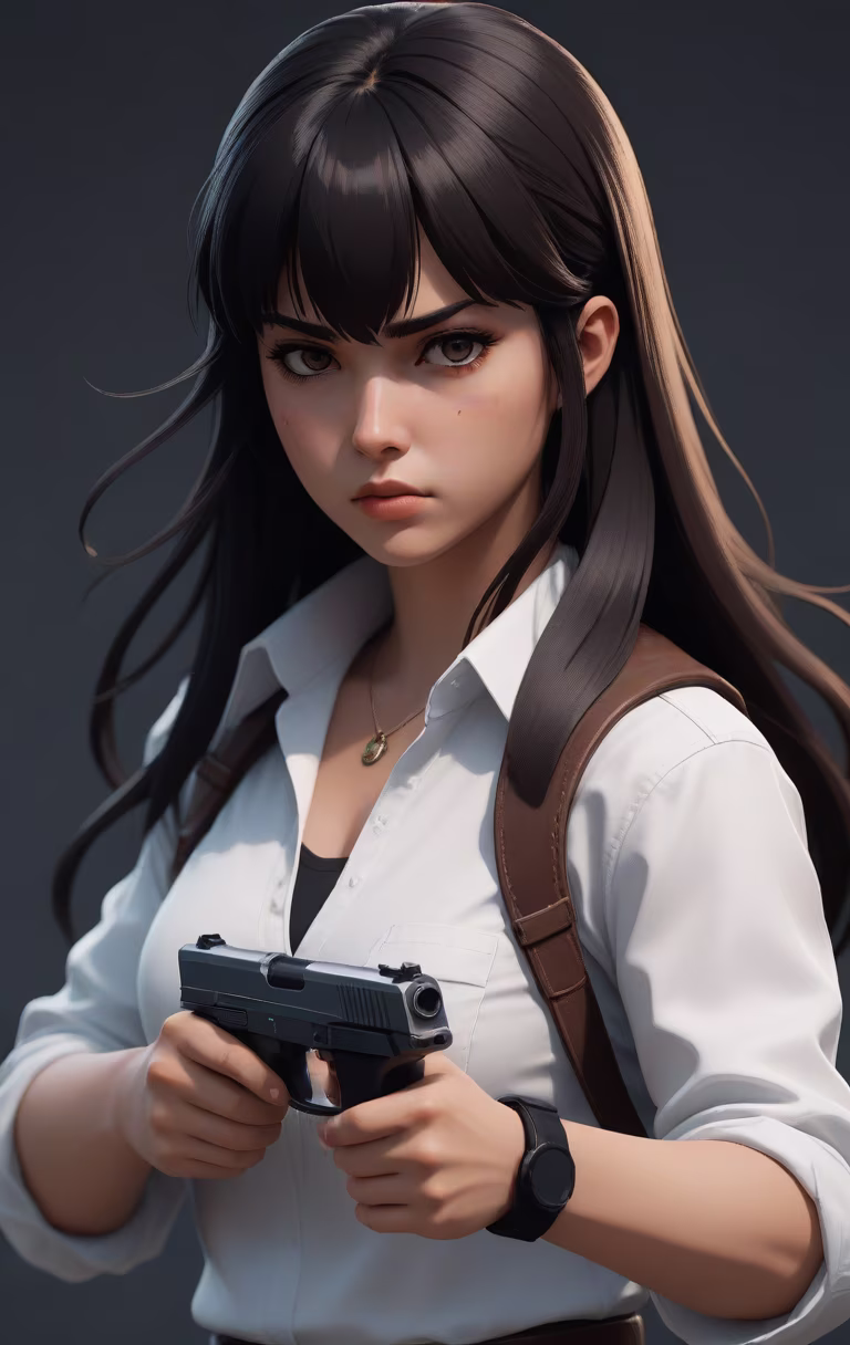 Prompt: A beautiful girl with long dark hair with bangs, in a white shirt and with a gun.directed directly at the viewer,looks at the camera from under his brows,an evil facial expression,in a dynamic action pose,,focus on the face,super-detailed complex photo,rendered in the style of comics,rendered in maya,junglecore,dark brown and white,realism with soft focus,Neogeo,trescore,stylized to 750.8k,UHD,RAW,