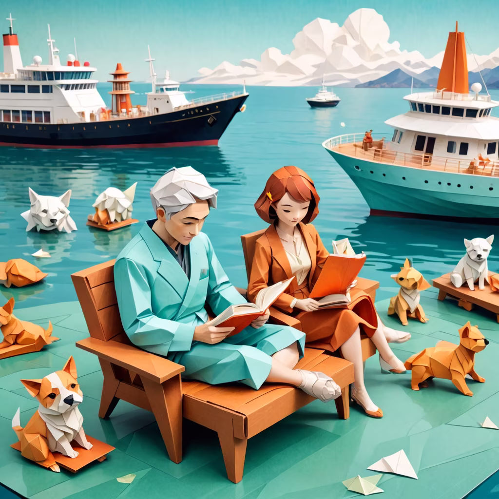 Prompt: a dog flat 2D style illustration, a man and woman sitting on a chair on the docks of a cruise ship and reading books on a deck, in the style of Victo Ngai, aquamarine and amber, historically accurate