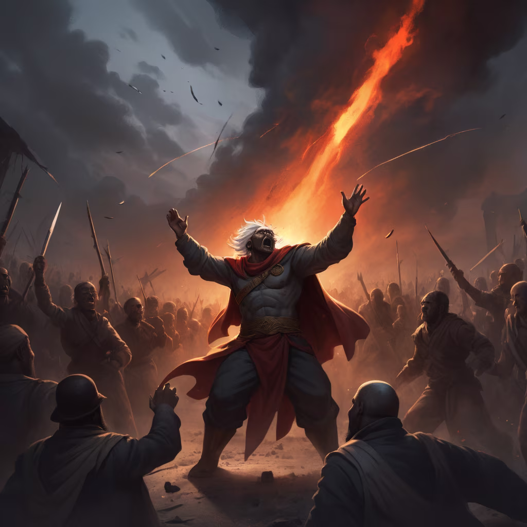 Prompt: Generate an image symbolizing the devastating moment of Babidi's betrayal on 'Île d’Azural,' where Babidi is only depicted from behind. Show a scene of turmoil and upheaval, highlighting the impact of his treacherous actions. Illustrate Babidi in a position of authority, facing away from the viewer, betraying Tapion and the resistance. Depict the resistance fighters' conflicted emotions, symbolizing the pivotal moment where trust is shattered. Capture the atmosphere of betrayal, shock, and despair, emphasizing Babidi's decisive actions from a perspective where his face remains unseen, echoing the sense of obscured truth and treachery
