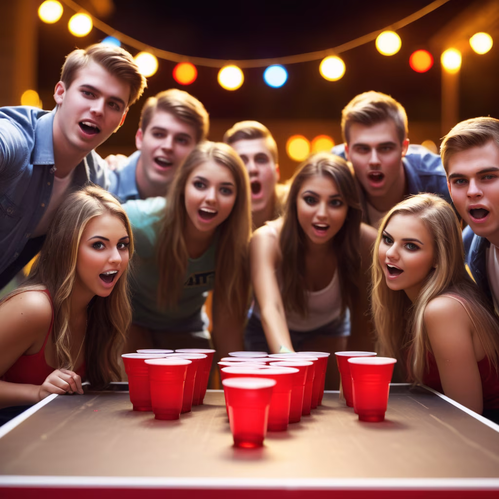 Prompt: a realistic and detailed image of a group of frat guys and sorority girls around a beer pong table at a wild college party. Photo-realistic