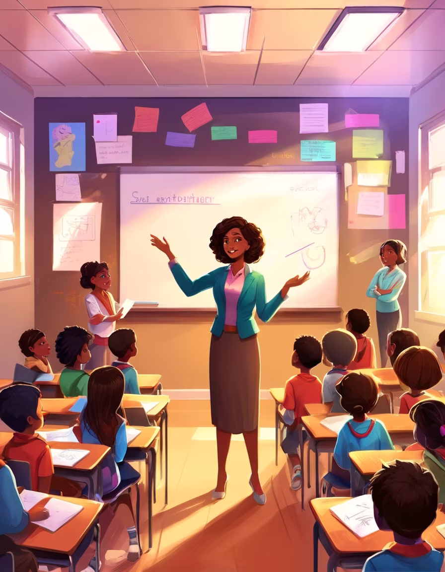 Prompt: teacher standing in front of a classroom of 5th graders, teacher dressed appropriately, children eager to learn, looking up towards teacher, female teacher