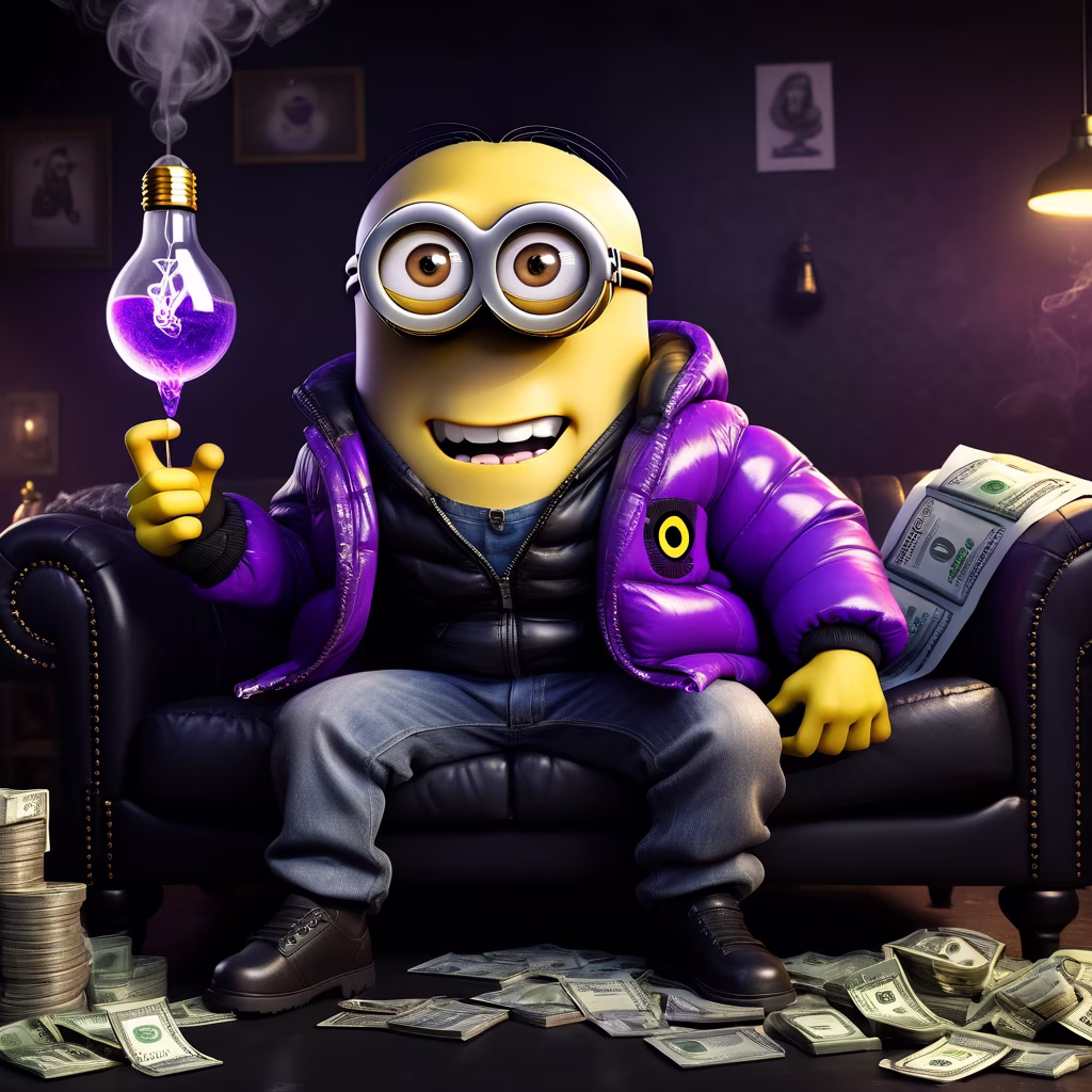 Prompt: Prompt: photorealistic minion from despicables with golden teeth sitting on a couch holding purple potion with smoke coming out of the bottle in pitch black room smiling. one light bulb hangs from the ceiling above him. minion is wearing nig black puffer jacket shoesand surrounded by money. 8k resolution, photorealistic, traphouse, drill, gangster