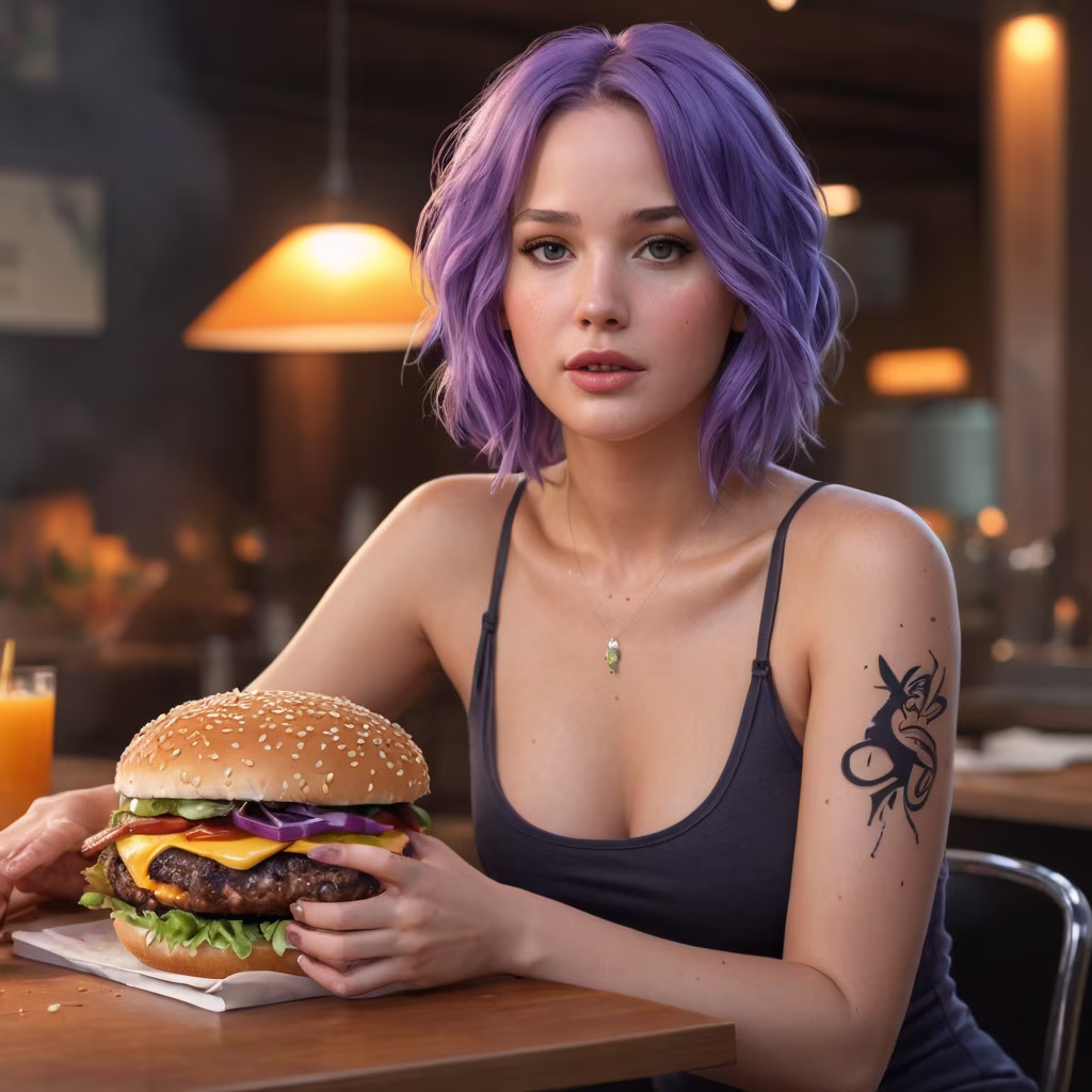 Prompt: beautiful jennifer lawrence with purple hair tattoos, eating a Big Mac hamburger, full body fantasy art icon, 2D art GTA5 cover, dripping BBQ sauce, serving burgers, official fanart Behance HD Artstation, by Jesper Ejsing, by Rhads, Makoto Shinkai and Lois Van Baarle, Ilya Kuvshinov, Rossdraws.