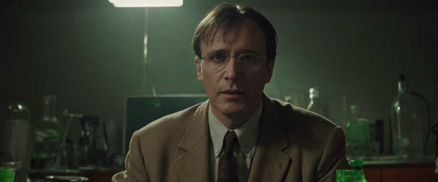 Prompt: young jeffrey combs as the reanimator is a crazy scientist who created an abomination insect humanoid. he makes some experiences in a laboratory. green light artificial light, horror ambiance, lovecraft realistic ambiance, CGI,