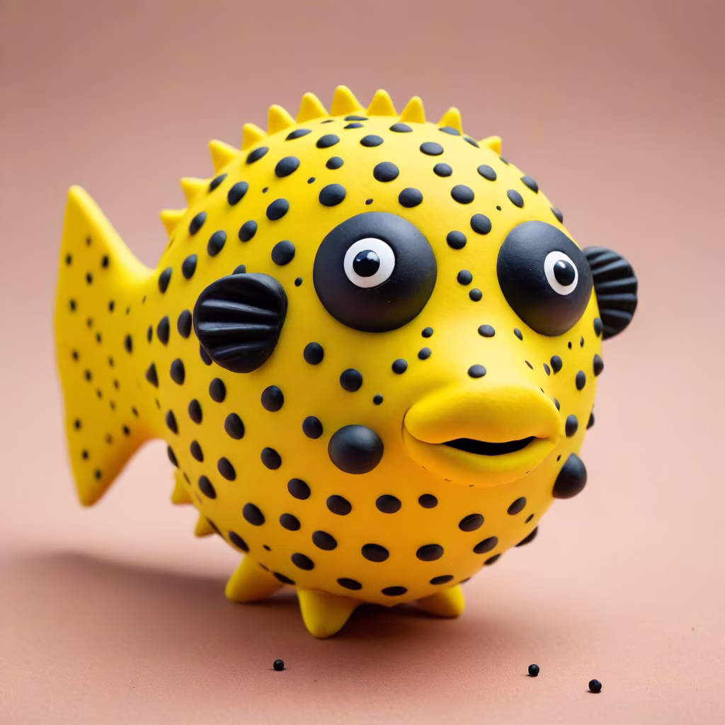 Prompt: Generate an image of a yellow pufferfish with uneven small black spots on its body, as a human