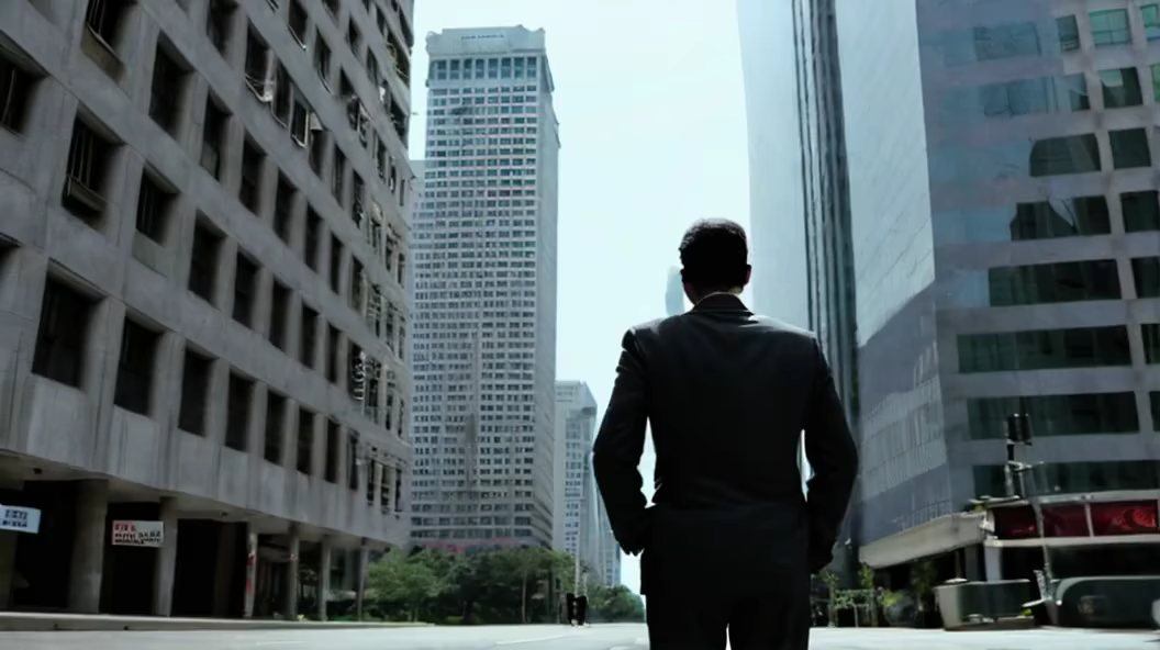 Prompt: A man in a suit sits on the rooftop smoking a cigarette and watching the sunset over the city