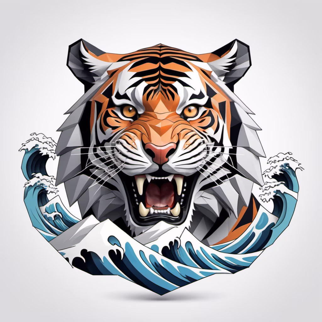 Prompt: watercolor style, a crouching tiger with Japanese ukiyo-e style ocean waves around it, white background