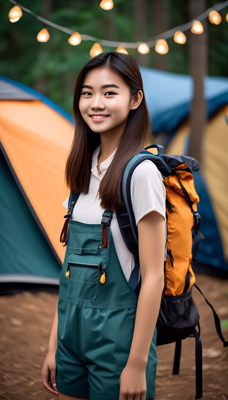 Prompt: A stylish Asian teenager stands in a camping store wearing a fashionable summer outfit, with a backpack on her back. She confidently holds a folding chair in her left hand while carrying a portable lamp in her right hand. She faces the camera, her full body visible, against a backdrop of a wooden wall adorned with an array of camping gear.