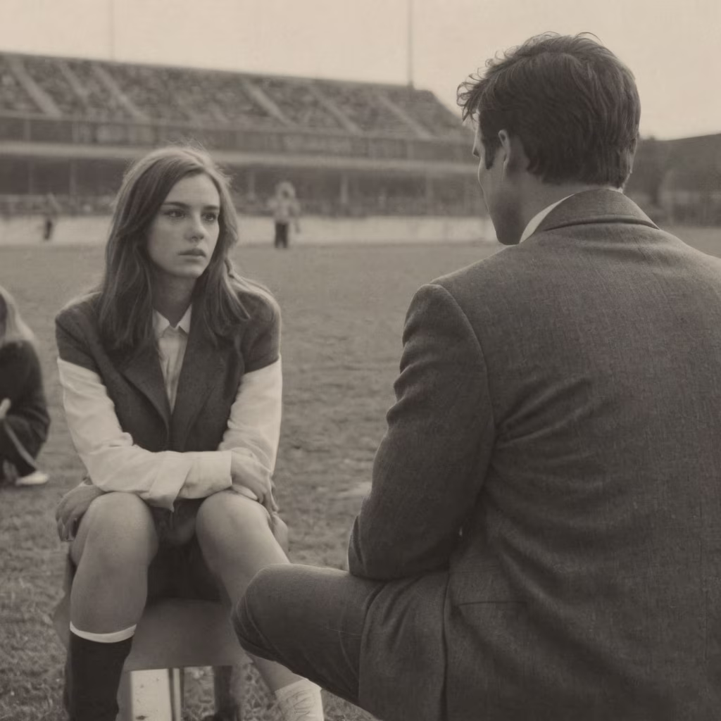 Prompt: a high school couple sitting in a football ground in the background with an adult couple looking separate ways in the forground