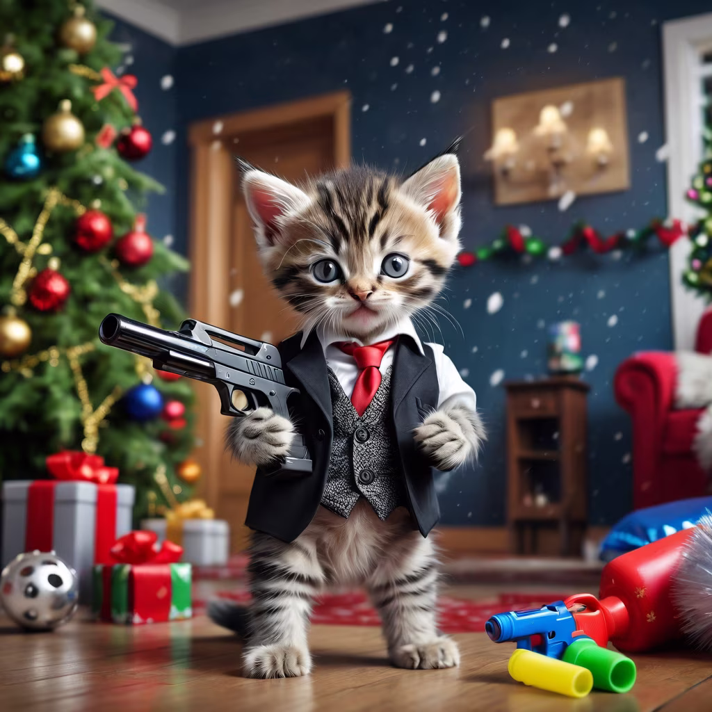 Prompt: realistic small kitten dressed up as a gangster, stading with a watergun and looking towards the viewer, cozy room backround, christmas, real life picture, real kitten