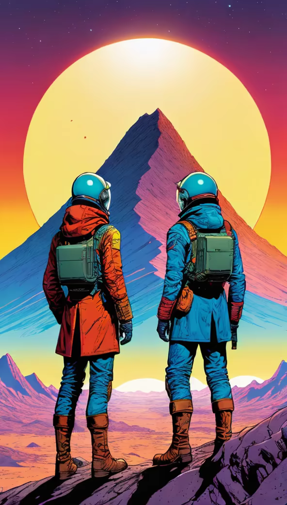 Prompt: two space explorers on an alien world face away, staring at a giant mountain with the sun setting behind it, stars are above in the sky, moebius art style, vibrant colors, 8k