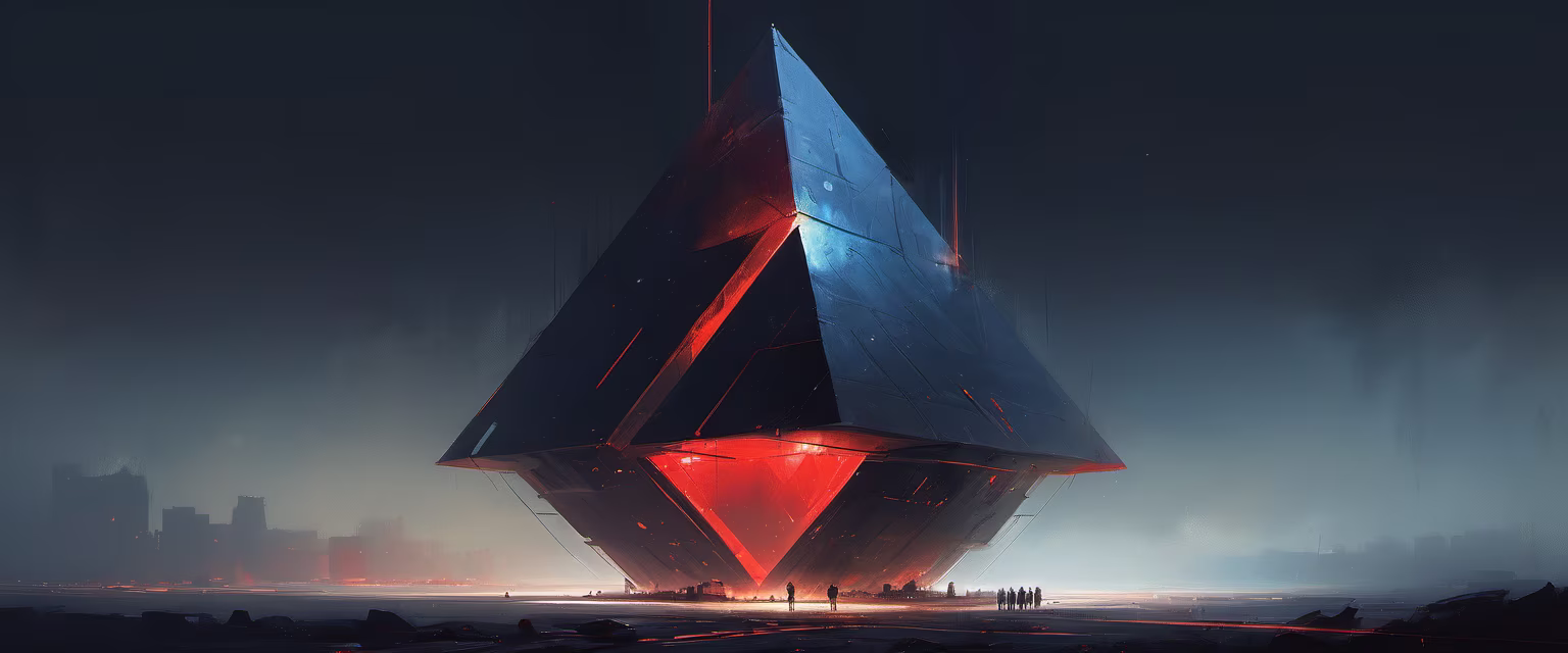 Prompt: by ((Mark Demsteader)) and (Alena Aenami), massive triangle-shaped space station at space in fog, gold and red and indigo and grey and black color