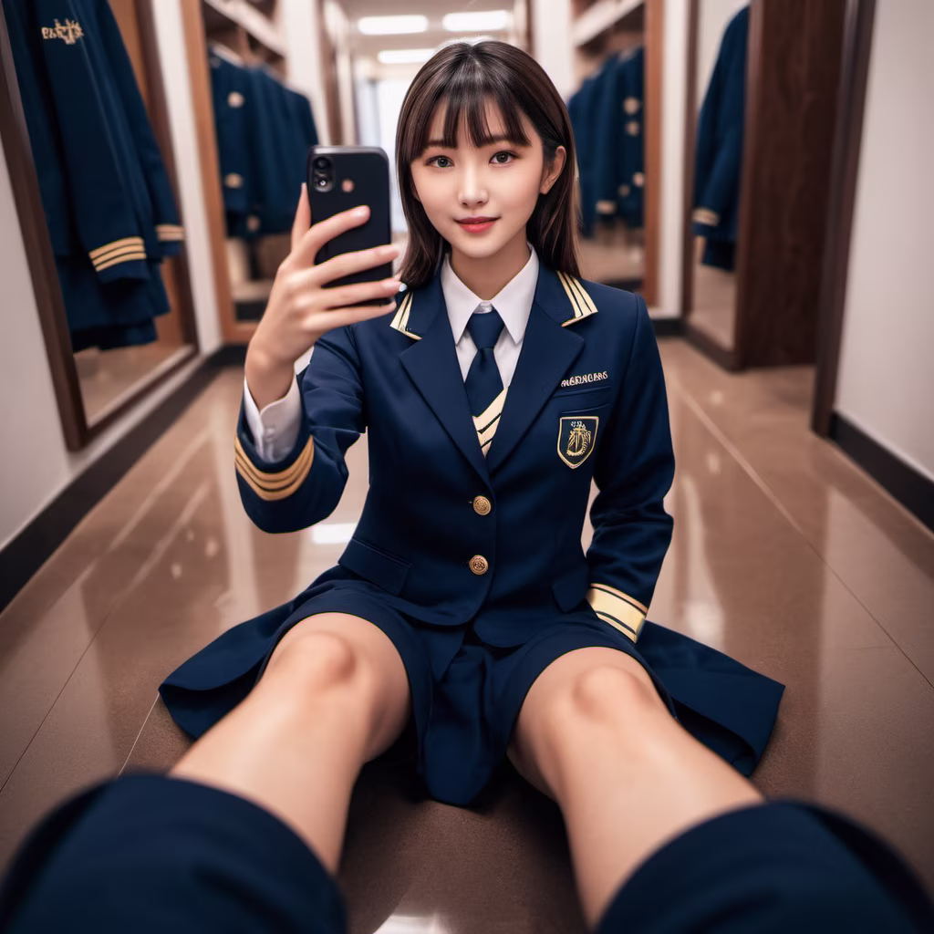 Prompt: A barefoot Chinese girl in a sexy skirt sits on the floor and takes a selfie in the mirror