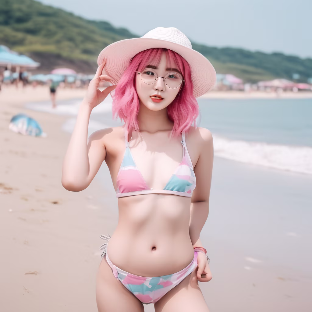 Prompt: A 20-year-old South Korean girl with pink hair, wearing glasses and a hat, is standing on the beach while dressed in a bikini