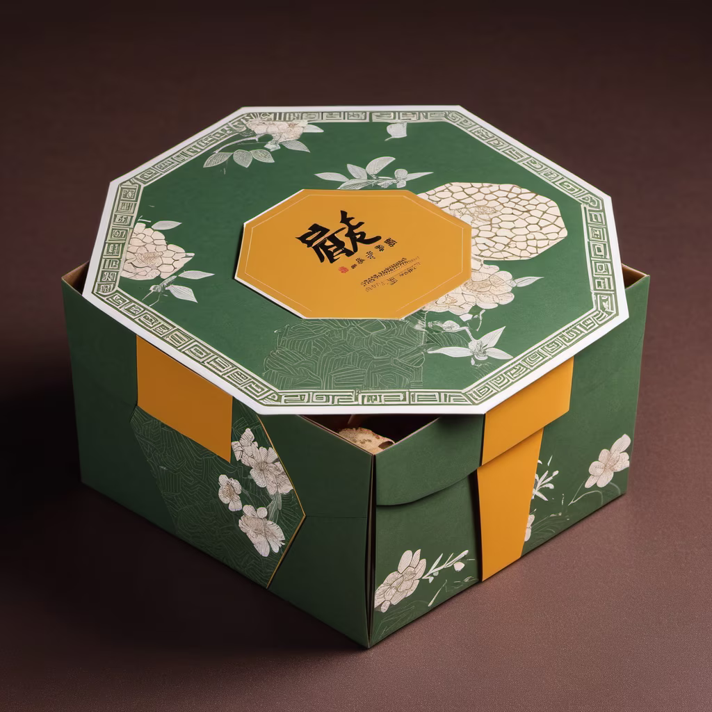 Prompt: Eco-friendly pastry packaging carton, white, green and brown textured paper, hexagonal, pull-out design, simple classical style, hot stamping technology, Chinese style Chinese painting background, Chinese style, creative