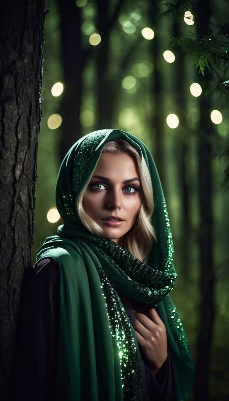 Prompt: a beautiful blonde woman with sparkling green eyes, covering her face with a tattered grey headscarf. Standing behind a tree in a haunted forest at night.