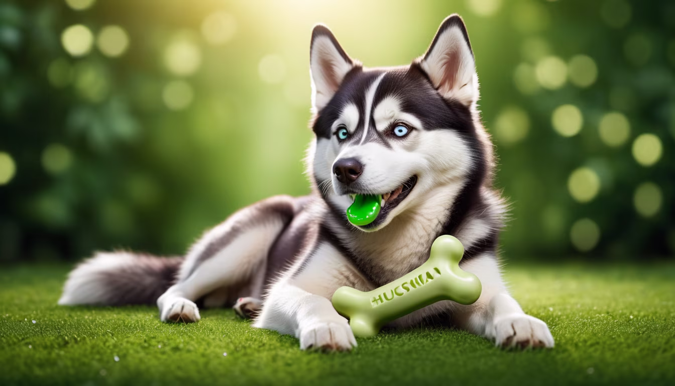 Prompt: A full-body view of a husky lying down, happily chewing on a green dental bone, with no background, in a photorealistic style.