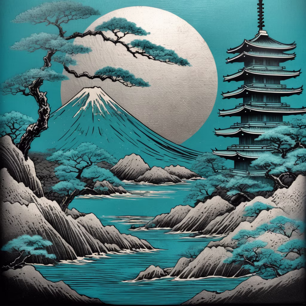Prompt: traditional japanese nature scene inspired by Hokusai or Hiroshige in a brutalism style painting turquoise ink on gunmetal textured background