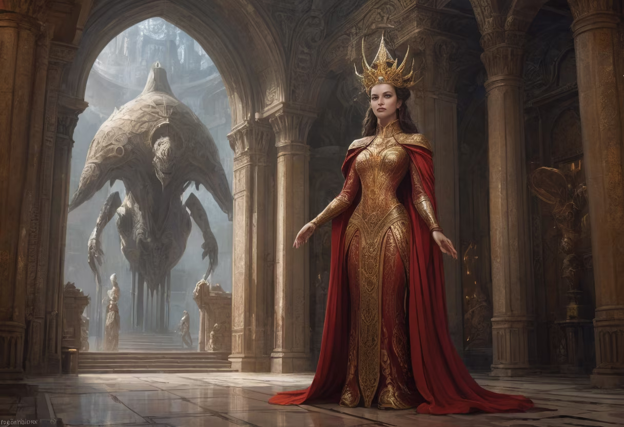 Prompt: Lee Bermejo Bill Carman Kerem Beyit Johfra Bosschart Ed Brubaker Arthur Adams Ronald Wimberly, photorealistic, movie still, cinematic lighting, a full figured queen emerging from a futuristic temple followed by 4 bodyguards, latex, crushing the enemy, kneeling in front of the emperor, bowing head, agonizing, intensely stubborn, red white black, fish head bubble, detailed