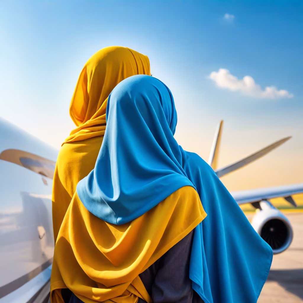 Prompt: a couple sitting on the wing of airplane,man and woman, woman wears a hijab,their clothes are blue and yellow. sky bakground,only the wing of the airplane can be seen. back view.