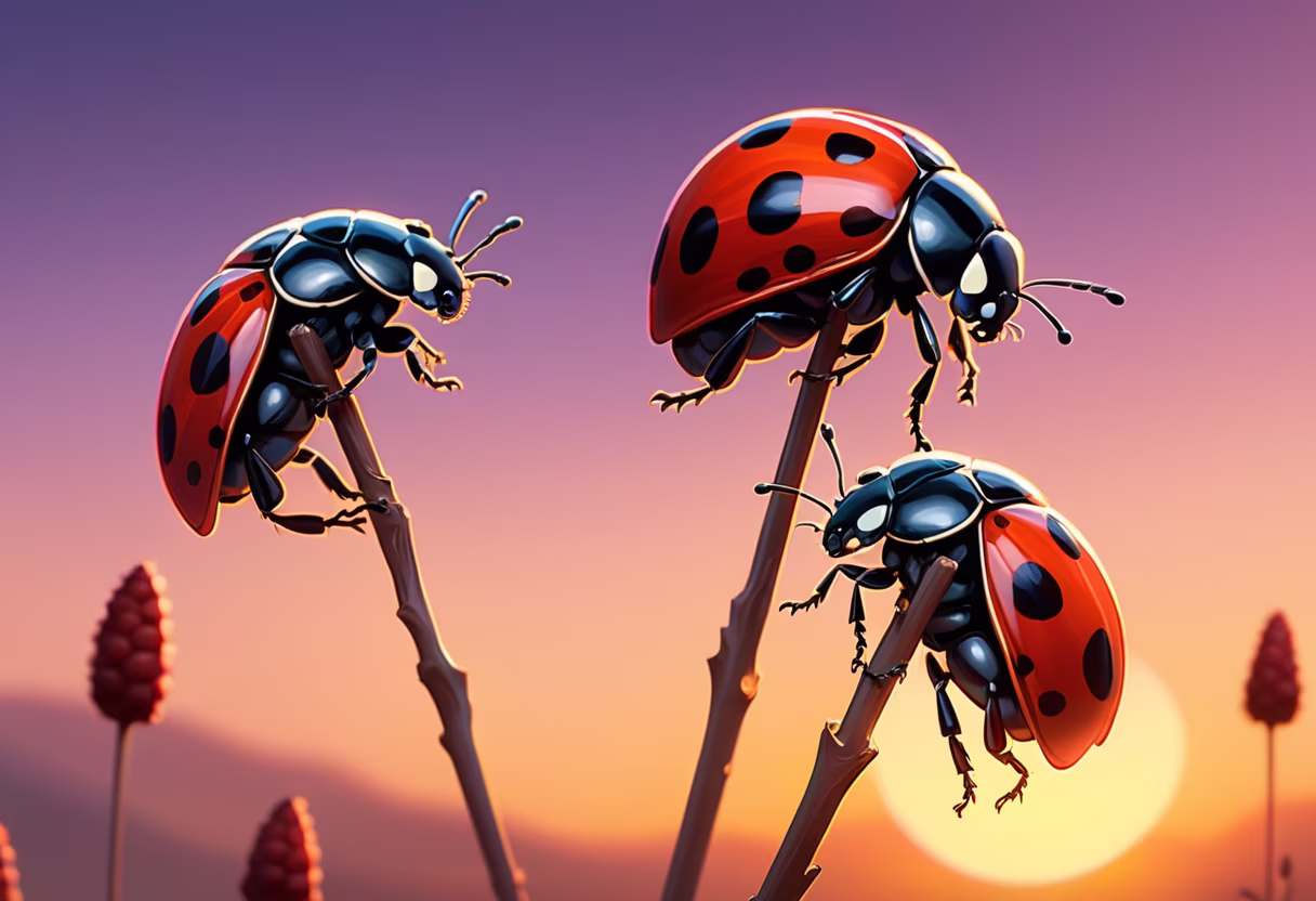 Prompt: three ladybugs on a stick in the sunset, in the style of li wei, spectacular backdrops, naturalist aesthetic, bugcore, night scenes, photorealistic fantasies, hard backlighting