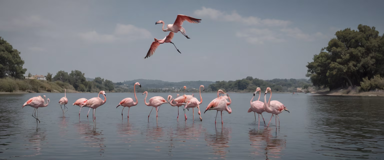 Prompt: flamingos flying over the water with another bird, a bird on it, in the style of gilbert garcin, nature-inspired camouflage, frank quitely, photo collage landscapes, serge marshennikov, detailed crowd scenes, delicate markings