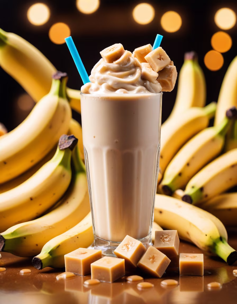 Prompt: A banana milkshake, in a pile of bananas, with some silky caramel candy cubes in the background