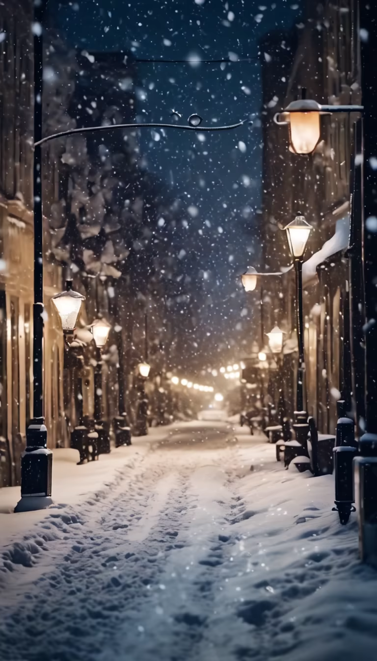 Prompt: Snow-covered street between Soviet five-story buildings at night under the light of street lamps.