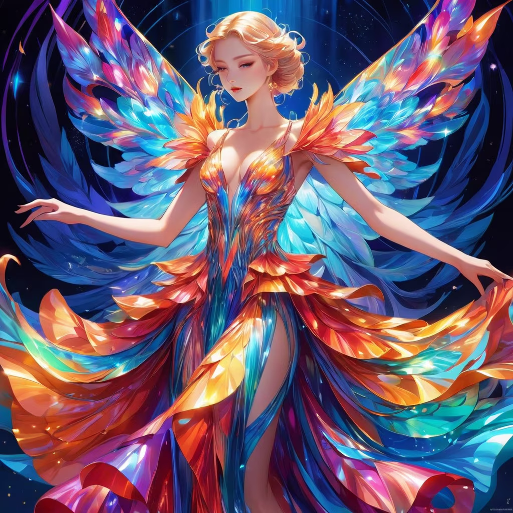 Prompt: Picture a mesmerizing sight—a woman draped in a vibrant, luminescent dress, radiating an array of captivating colors that shimmer and glow, creating an enchanting and dazzling presence, mesmerizing, vibrant, detailed, luminescent beauty, colorful elegance, art by Iris Van Herpen, Alexander McQueen.