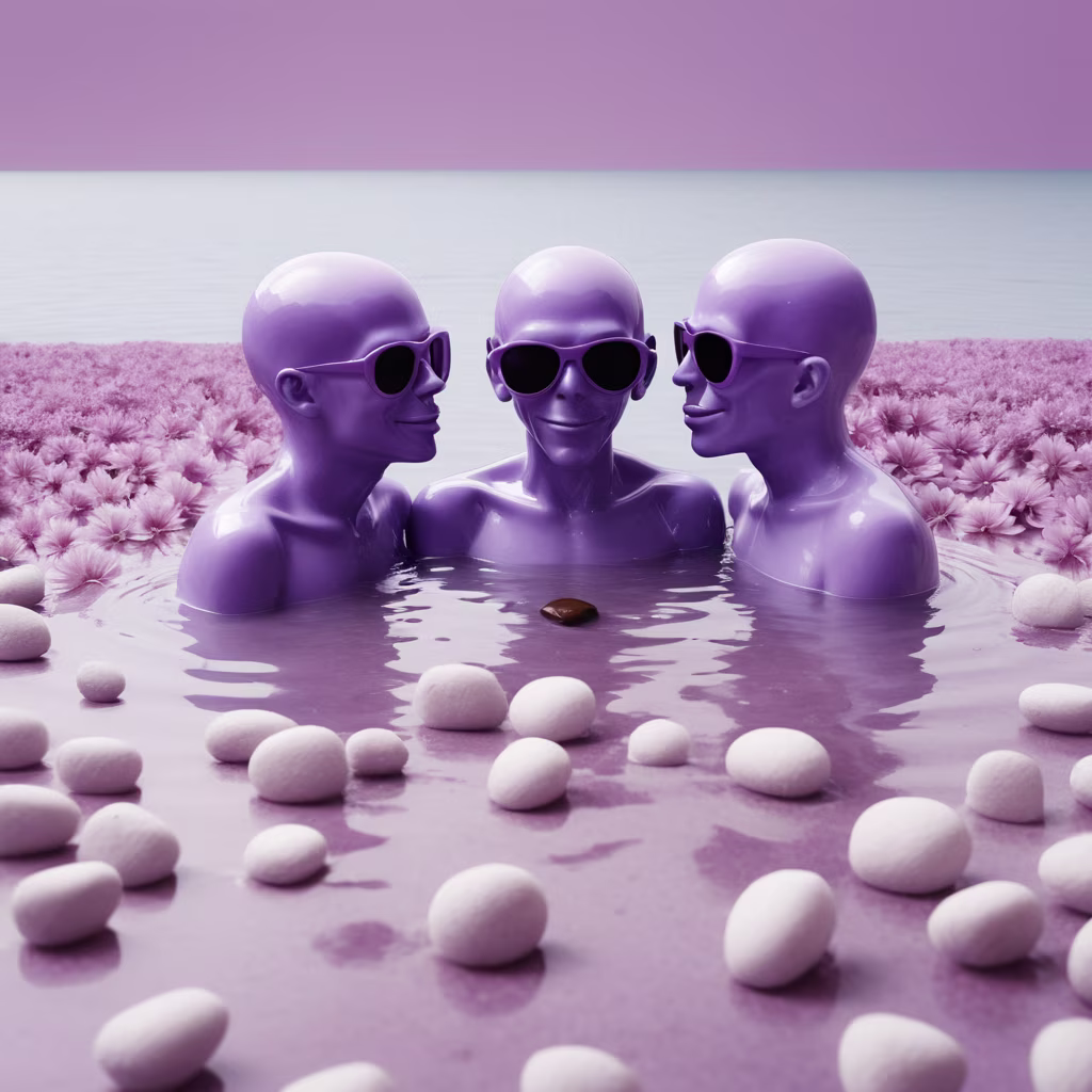 Prompt: \"Shared Laughter: A Bond Uniting Hearts, Sweet treat, Lilac, Coconut oil, Pool chlorine smell, Stones, Mushrooms, Flowers, Lake, Chewing gum, Laughter, Kisses, Death, Existential emptiness, MP3, art direction Made by Blur style and Pet Shop Boys style and Bowie and Babasónicos