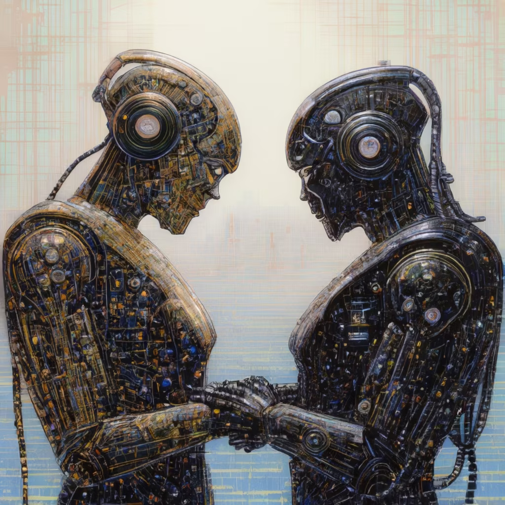 Prompt: Painting of two AI by Monet - powered robots in deep conversation, in the style of Katsuhiro Otomo. The robots should appear black, sleek and futuristic, with intricate, circuit board - like details on their metal bodies. futurist, transhumanism, cyberpunk, neo-noir
