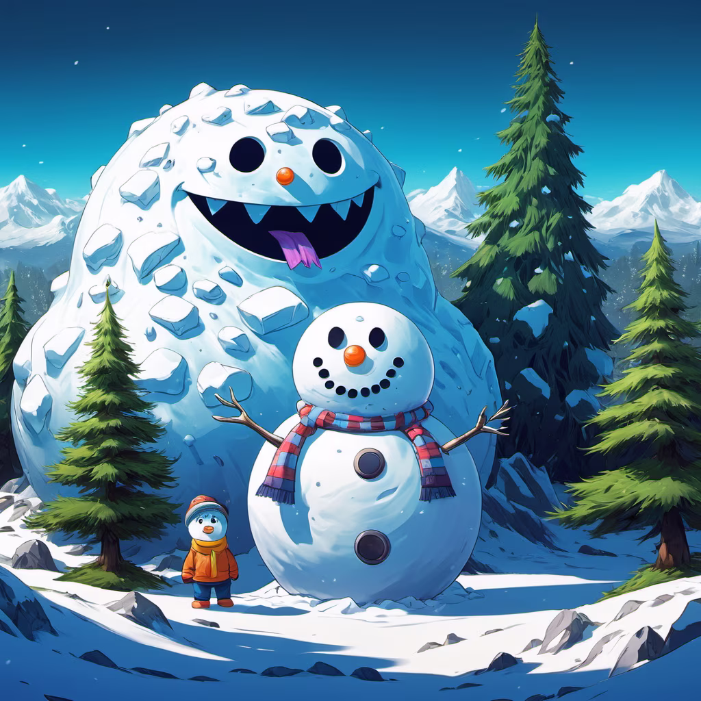 Prompt: A snow monster and a snowman are on the hemisphere, with grass and pine trees on the hemisphere