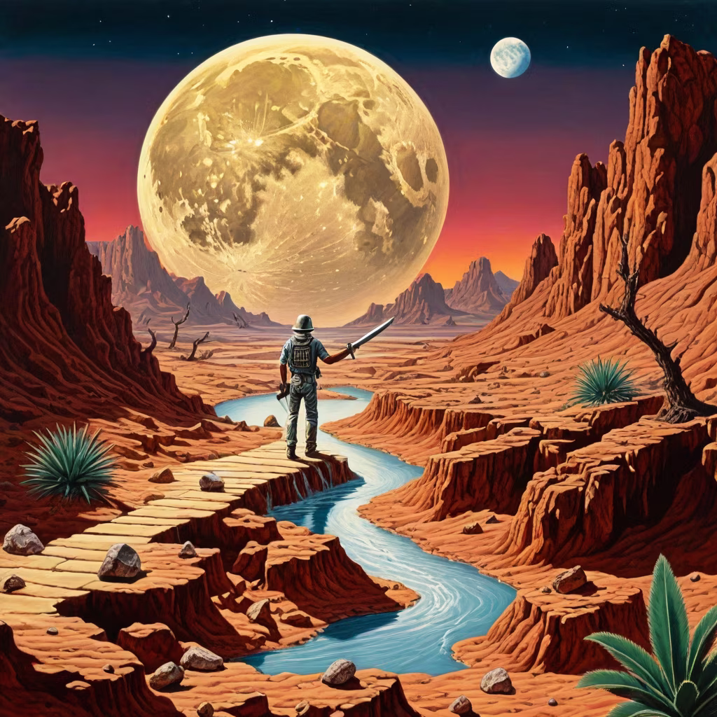 Prompt: painting of a river running through a desert landscape with a giant moon in the background, chainsaw sword, neosurrealism, break of dawn on venus, saw teeth, progressive rock album cover, diecut, planetes, stairway to heaven, hyperrealistic aesthetic, cut, utopia, trending on pintrest, 1 9 8 0 s sci - fi movie, saw