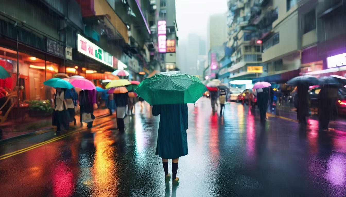 Prompt: Rainday of shenzhen,young people walk in the Street,fashionable attire,Holding an umbrella,(Full Length Shot:1.3),(two shot:1.3)