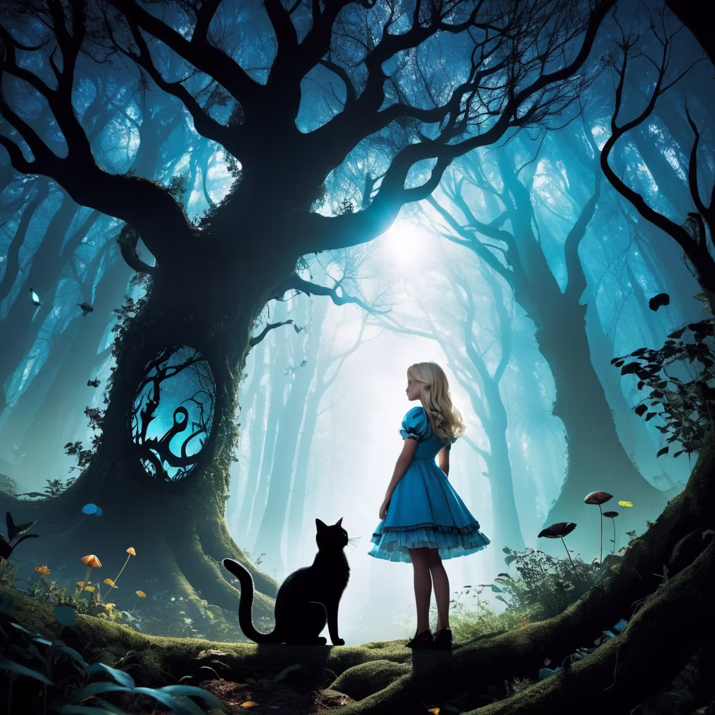 Prompt: gorgeous insanely detailed elemental Alice in Wonderland, Alice in the forest talking with the (Cheshire Cat with a (Cheshite Cat double_exposure_silhouette_art with a Giger shadow Cheshire Cat. The cat is sitting on the tree and Alice is standing on the ground. The cat has a huge, unrealistic smile. Alice has blonde hair and blue dress. Cute, children's story book, art, masterpiece, hyper detailed!!! by Robert Farkas and Rimel Neffati and Carne_Griffiths :: dramatic backlight :: run rays :: ink splash and color explosion :: sharp_focus :: Astonished kid :: ethereal :: chiaroscuro :: grave_of_fireflies :: double_exposure_silhouette_art :: splash art :: vivid_colors :: surreal_fantasy