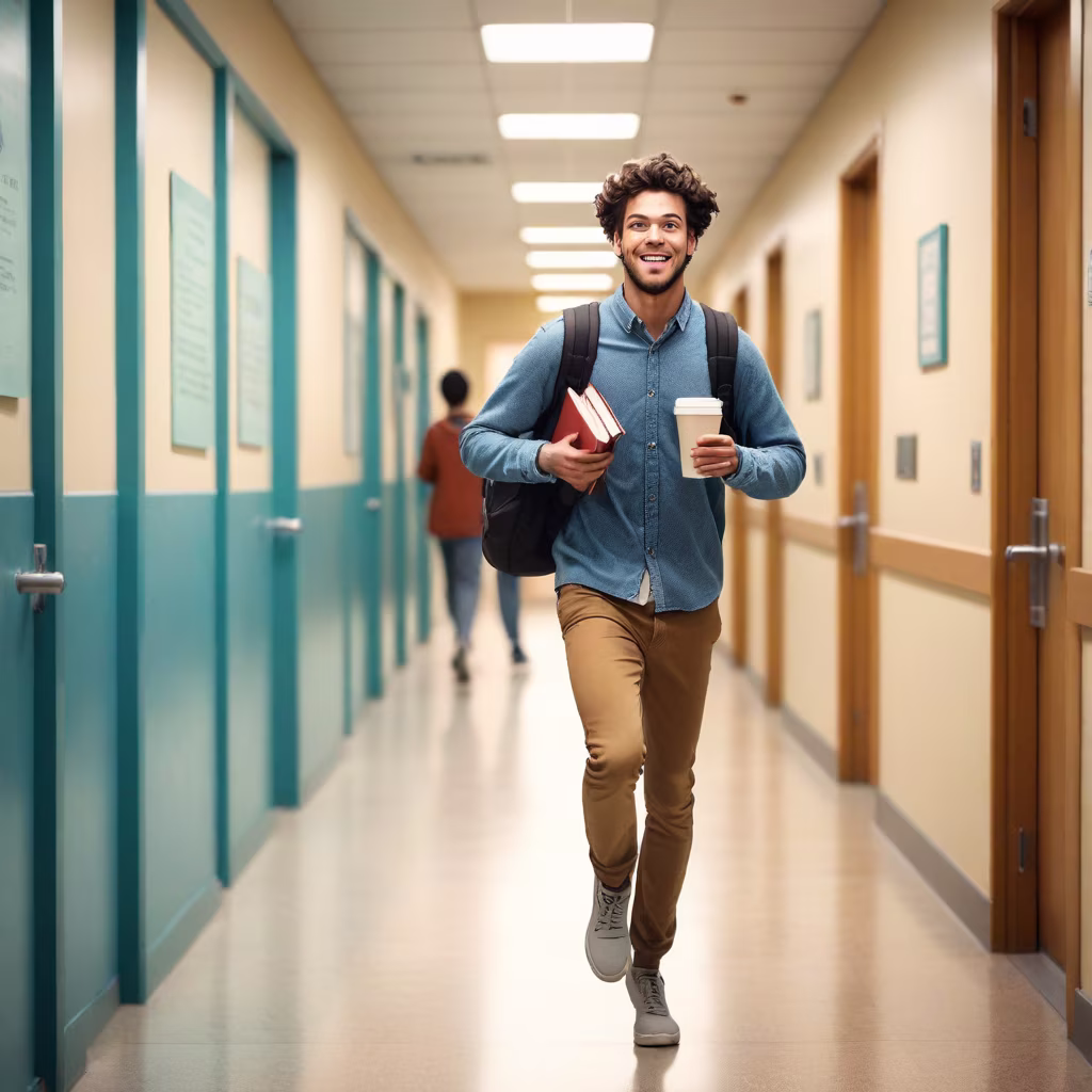 Prompt: realistic high-quality image of a student running in the university corridors as he tries to get to class on time when the lesson starts, he holds books in his hands that he tries to hold firmly so they don’t fall during the run, and a cup of coffee that because he ordered it he had to hurry