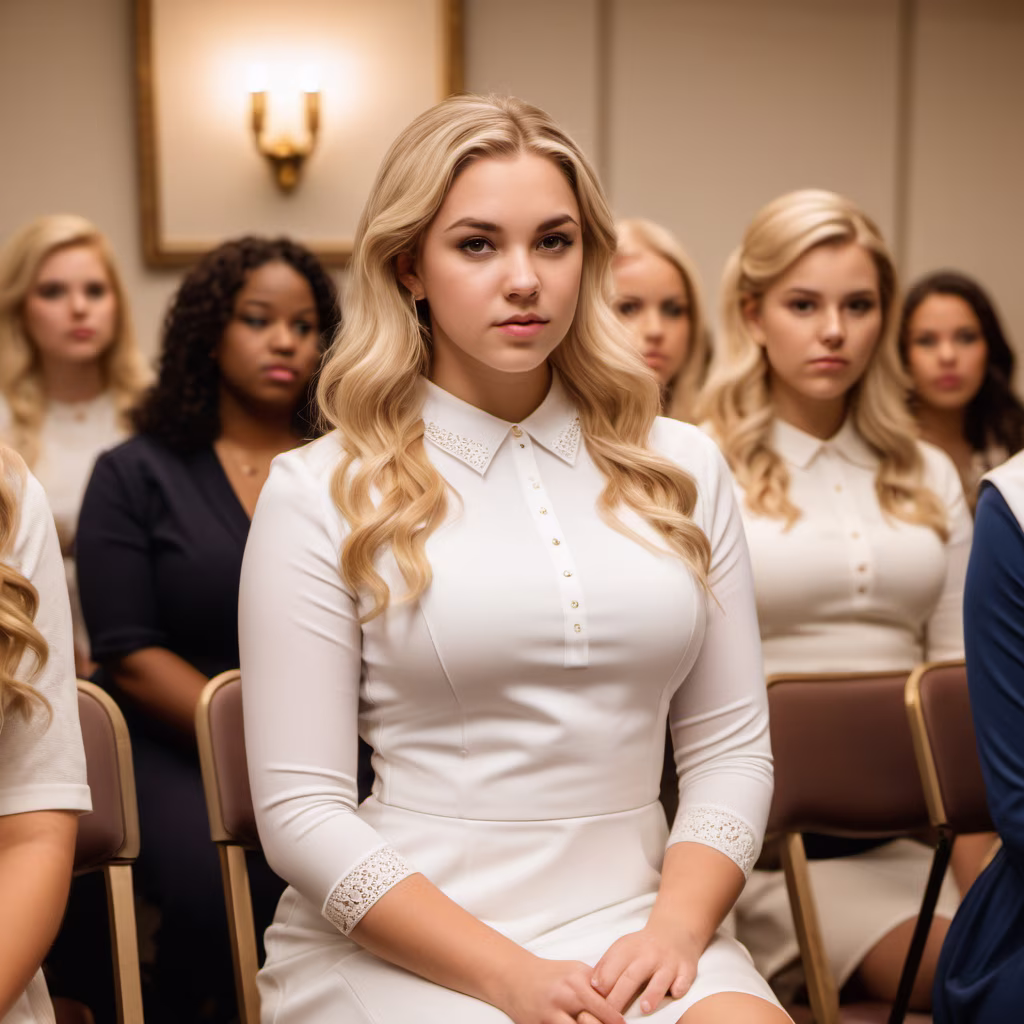 Prompt: warmly lit, opulent sorority meeting room. In the center, a full-figured young woman with soft blonde hair and high cheekbones kneels. She is wearing a white pledge dress.